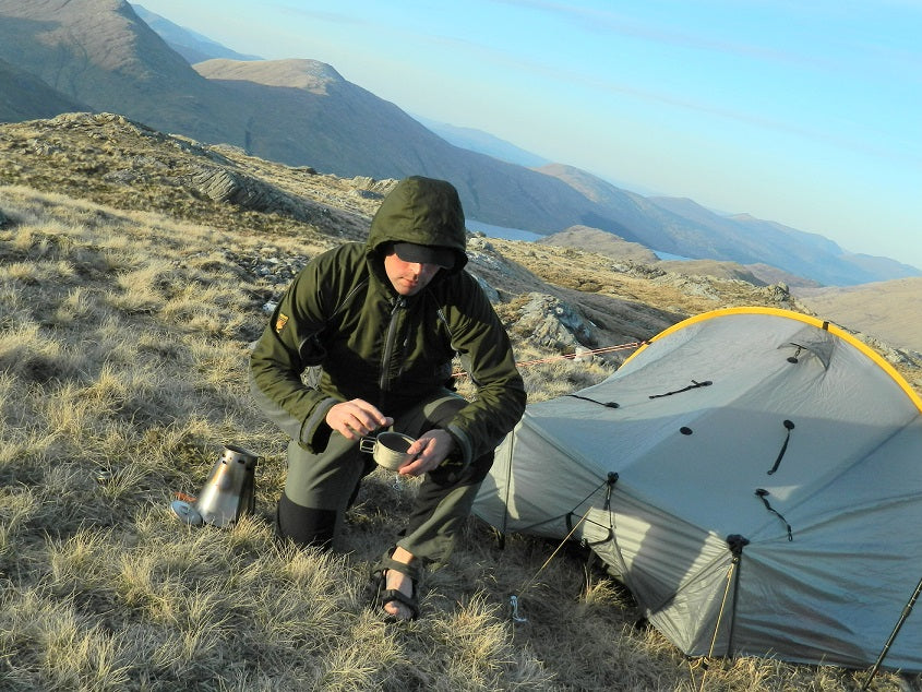 Mark Waring with his Fissure Ti-Tri and Snow Peak Mini Solo in Scotland