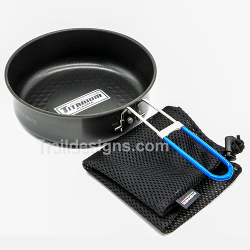 Evernew just came out with this top quality, light weight sauce/frying pan that's ideal real cooking when you're out in the wilds. A simple, effective design that minimizes weight and maximizes capacity. It features a durable Titanium plasma non-stick coating, insulated/folding handle, and a honeycomb shaped bottom to provide high thermal efficiency and make your backcountry cooking easier.