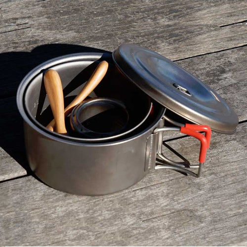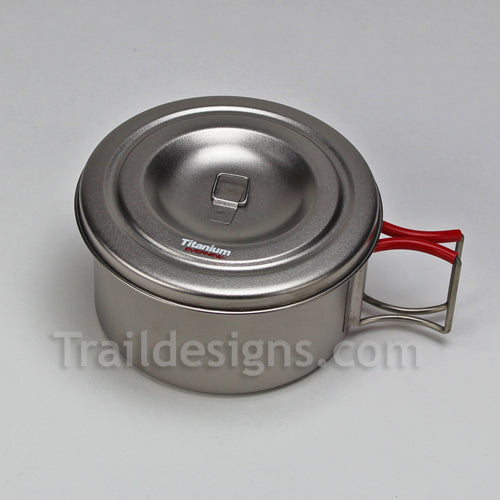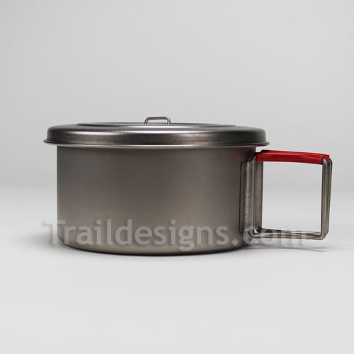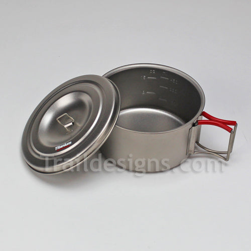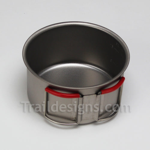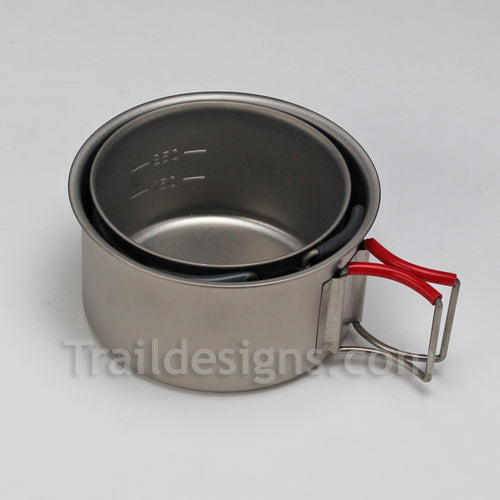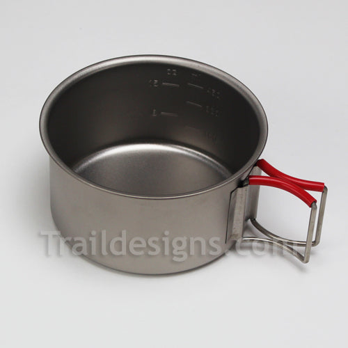 This is Evernew's newest ultralight titanium cook pot/mug. This pot is designed especially for backpackers who need to keep their pack weight as low as possible. Evernew reduced the pot's weight by eliminating the non-stick coating and using a thinner gauge of light weight and durable titanium. It also includes volume measurement lines and small silicone insulation tubes on the handles, and a large surface area for heating efficiency.  With these features it is extremely easy to use and carry.    Total volume is 570 ml.