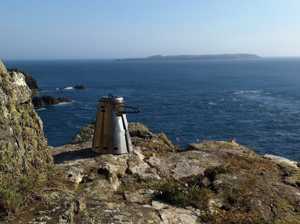 Jim Hudson trying his cone on a windy cliff in Pembrokeshire South Wales. Worked perfectly, tea made in minutes.