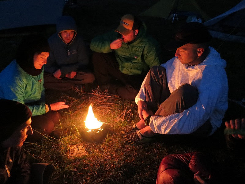 Elizabeth Thomas sends us this picture of a group of Gossamer Gear ambassadors keeping warm in the Olympics around Barefoot Jake's Inferno.