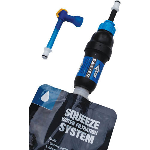 - Remove the push pull cap from your filter and attach the blue Fast Fill adapter. Connect the Fast Fill adapter to the quick disconnect on your drink tube and slowly squeeze the Sawyer pouch to fill the bladder.