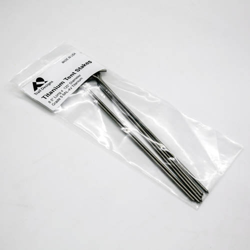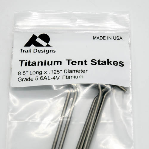 Trail Designs Titanium Tent Stakes are new and improved. They now feature a tighter diameter top bend, with a more defined backbend, and less sheppard hook shape. These design improvements keep the Apex of the stake over the spine while giving you more striking area. This results in a stake that is stronger, drives straighter, has less bounce back, and more holding power. And to make sure they are the best titanium stakes made, they are now using a 25% higher tensile strength work-hardened Grade-5 Titanium. This material has the hightest strength to weight ratio of any metal on earth. This means you get more strength for less weight. Lawson tent stakes strike the perfect balance between low weight and functionality. The long version measures 8.5" long, weighs .37oz (10.5 grams), and are made from .125" (3.17mm) diameter titanium rod which means they are thicker, stronger, and hold better than other "ultralight" stakes on the market. They are manufactured by Lawson, in house on custom made machinery, right here in the USA.