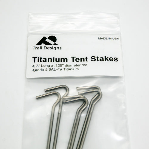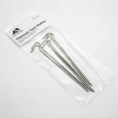 Trail Designs Titanium Tent Stakes are new and improved. They now feature a tighter diameter top bend, with a more defined backbend, and less sheppard hook shape. These design improvements keep the Apex of the stake over the spine while giving you more striking area. This results in a stake that is stronger, drives straighter, has less bounce back, and more holding power. And to make sure they are the best titanium stakes made, they are now using a 25% higher tensile strength work-hardened Grade-5 Titanium. This material has the hightest strength to weight ratio of any metal on earth. This means you get more strength for less weight. Trail Designs tent stakes strike the perfect balance between low weight and functionality. They measure 6.5" long, weigh .28oz (8.1 grams), and are made from .125" (3.17mm) diameter titanium rod which means they are thicker, stronger, and hold better than other "ultralight" stakes on the market.