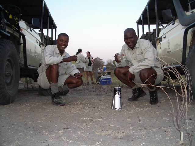 Ishmael and Anthony, safari guides for Chief's Camp in Botswana Africa, evaluating the Caldera Keg during a break in the game drive.