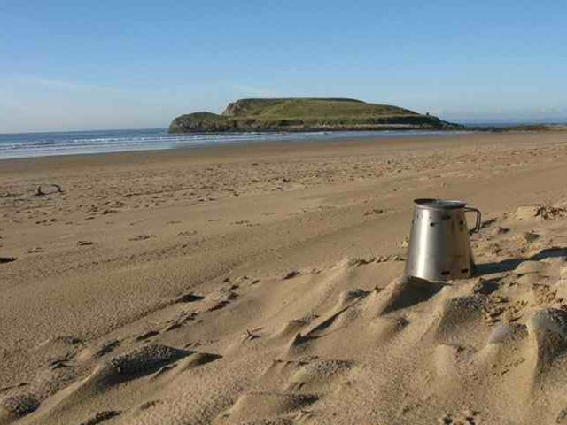 Jim Hudson making tea with his Ti-Tri at Rhossili Bay in Wales