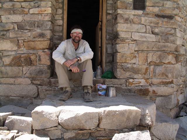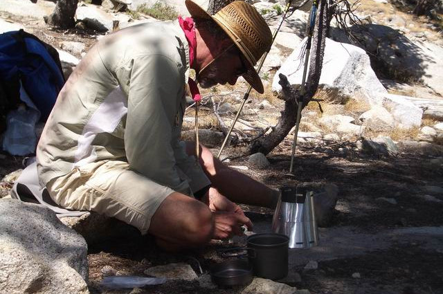 Rand makes lunch at the Muir Hut on the JMT at Muir Pass