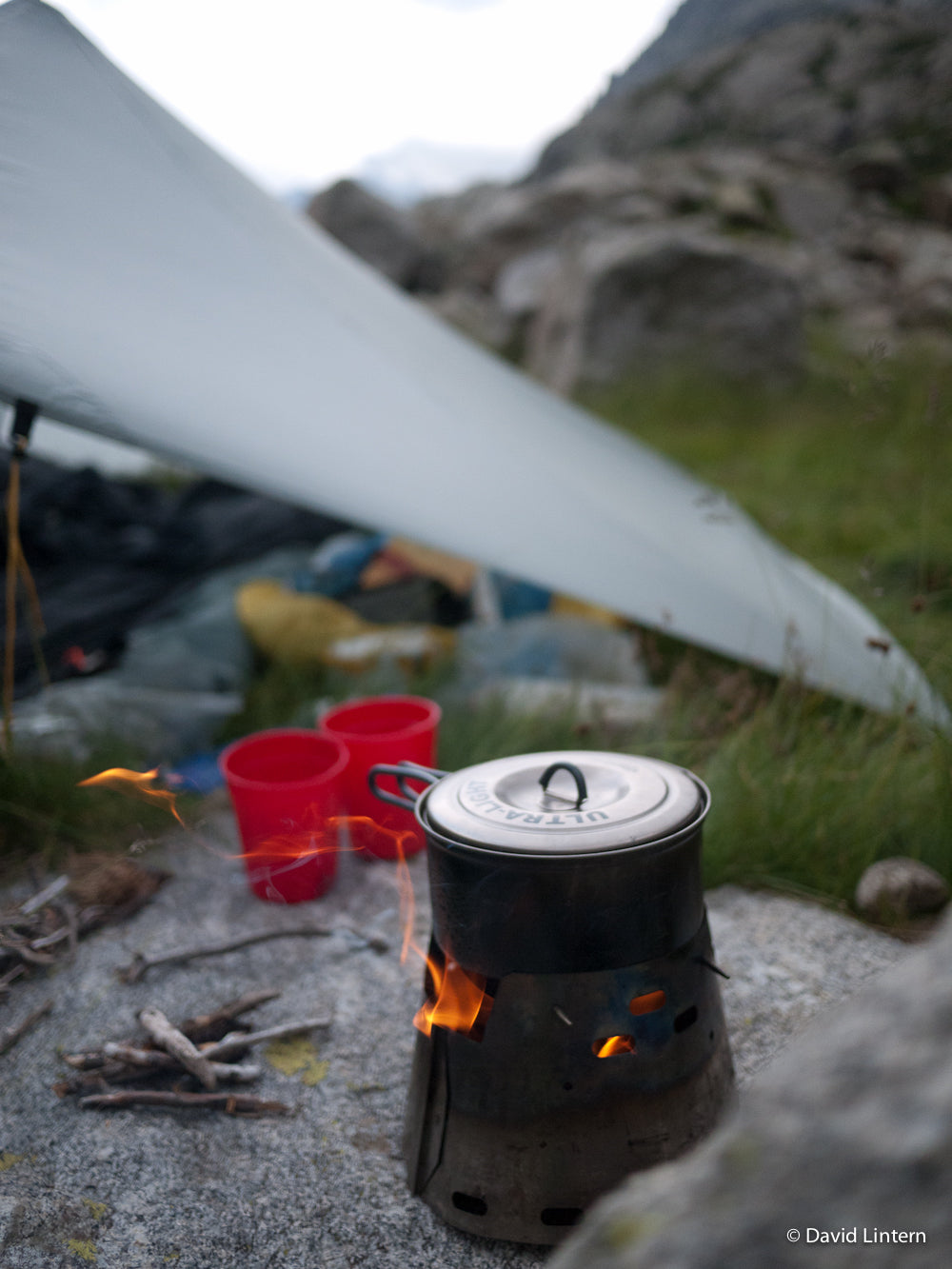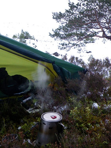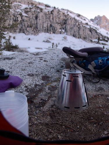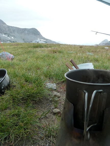 This shot is of Warren Greer's camp at Lower Relief Valley in the Immigrant Wilderness where he's using his Caldera Cone Keg-H in Esbit mode. He got full boils with approximately half a tab of Esbit!