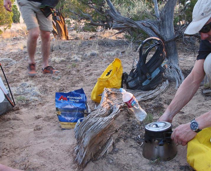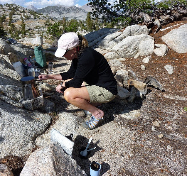 Carol Moses making cornbread with esbit and her Ti-Tri in the Sierra Nevada mountains at Marie Lake.
