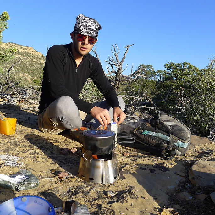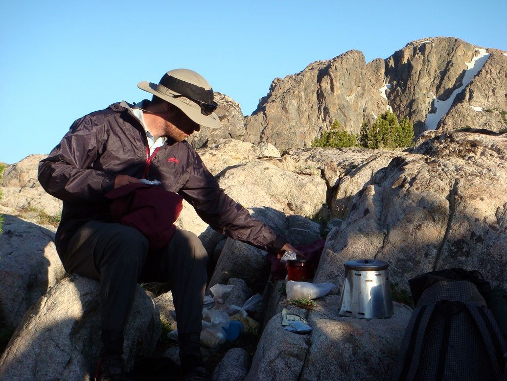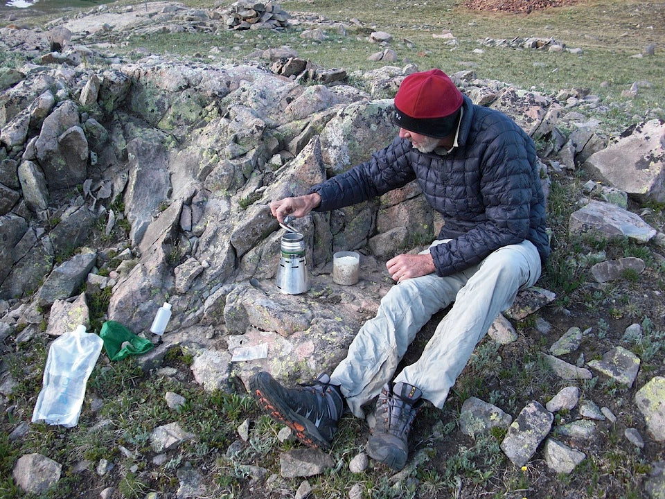 Steve Quinne cooking away at 11,000 ft with his Ti-Tri and esbit!