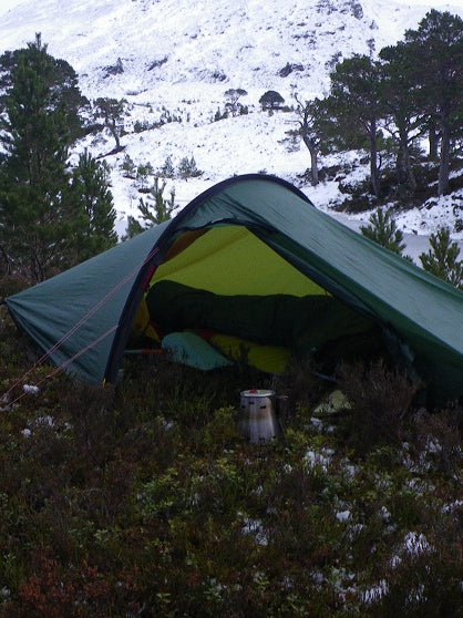 Robert Hudson at Skye ridge on a bivi just below the Inaccessible Pinnacle. Skye ridge is the only real alpine ridge in the UK. Robert notes: "The cone worked faultlessly and has on every other use previously and since". :-)