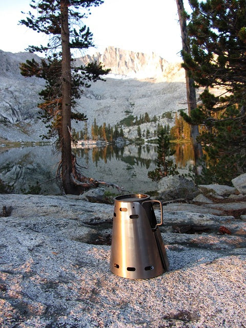 Doug Ide heating up morning coffee water at Lower Honeymoon Lake in the Sierras using esbit and his Ti-Tri for a RutaLocura 450 ti pot.