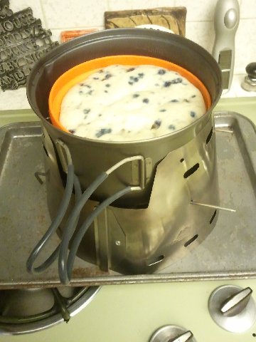 Lou Castle uses his prototype simmer ring and Sidewinder several times a week, even if he's not in the bushes! Here he's fixing a huge blueberry muffin for breakfast.