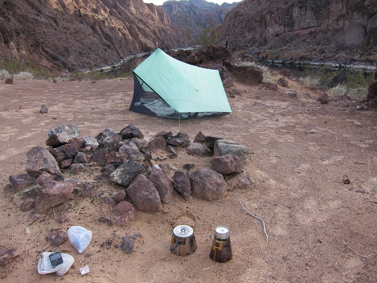 John Roan camping next to the Colorado River, a few miles south of the Hoover Dam near Arizona Hot Springs. The .6L Sidewinder and the Ti-Tri Keg-H side by side with his Zpacks Hexamid Twin and the river in the background.