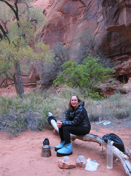 Elizabeth Thomas with her Keg-F system on the Colorado Trail. She notes: "I'm absolutely loving it--I've got some really long hauls between resupply points and the whole using only 15 mL of Heet to get a 2 cup boil thing is a lifesaver, especially hiking so late in season when all the tiny stores in these resupply towns are out of Heet!"