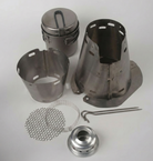 The Fissure Ti-Tri system includes the two-piece interlocking titanium cone custom sized to fit inside your pot, the lightweight aluminum 12-10 stove with integrated primer pan, and two titanium stakes for wood burning mode. (pot not included)Fissure Ti-Tri System - $139.95 (See bundled discounts below)